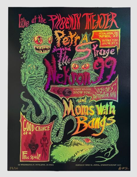 Recently, along with some fellow creative minds, Amin has formed a new project, a band titled Nekron 99. Their energetic debut album release party at the Phoenix Theater in Petaluma on Saturday, April 27th was an incredible event, bustling with the creative energy we would expect from Amin. Fellow Sticker Robot alumni were in attendance, Skinner, Zoltron, Alan Forbes, Revolution 9 joined by Bay Area bands Petra, The Strange, and Moms with Bangs.